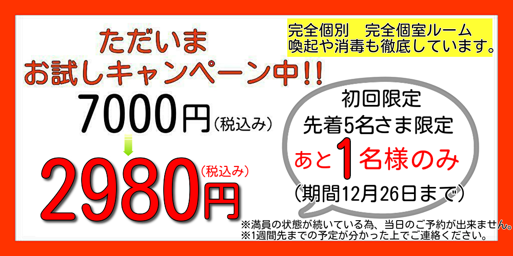 ※大変申し訳ありませんが、先着9名様以降のご予約は通常料金価格初回7,000円を頂戴させて頂きますので、初回特典割引をご希望の方は今すぐ下記のメールお問合せファームもしくはお電話よりがばい整体院までご予約のお電話またはメールをください