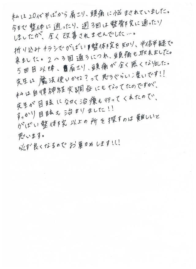 折込チラシでがばい整体院を知り、半信半疑で来ました。2~3回通うにつれ、頭痛が取れていきました。5回目以降、肩こり頭痛が良くくなりました。