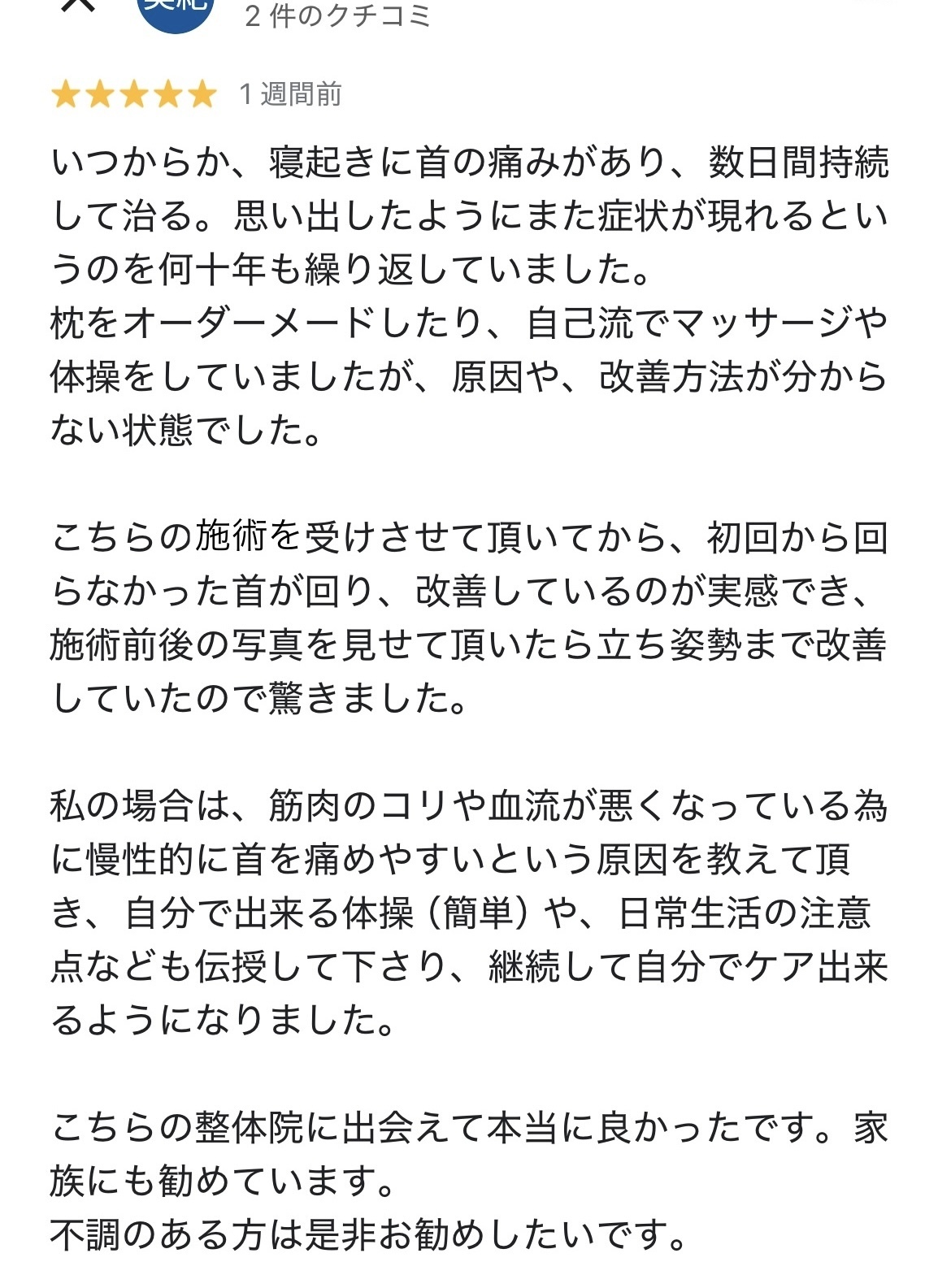 初回の整体で重かった首や肩が飛んでいくように軽くなりました。そればかりか頭もスッキリ!!!6回目にぐらいには頭痛も無くなり、頭痛薬も一切使わなくて良いまでに回復しました。頭痛薬のいらない生活は心身ともにすごく楽です。